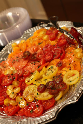 I like to cluster the tomatoes by size in a monochromatic fashion to add eye appeal. Make sure to bring the tomatoes to room temperature if they aren't already to truly taste the wonderfulness of this summer staple.